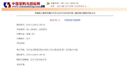 華潤(rùn)電力2016年第二批次集中招標(biāo)中一舉中標(biāo)